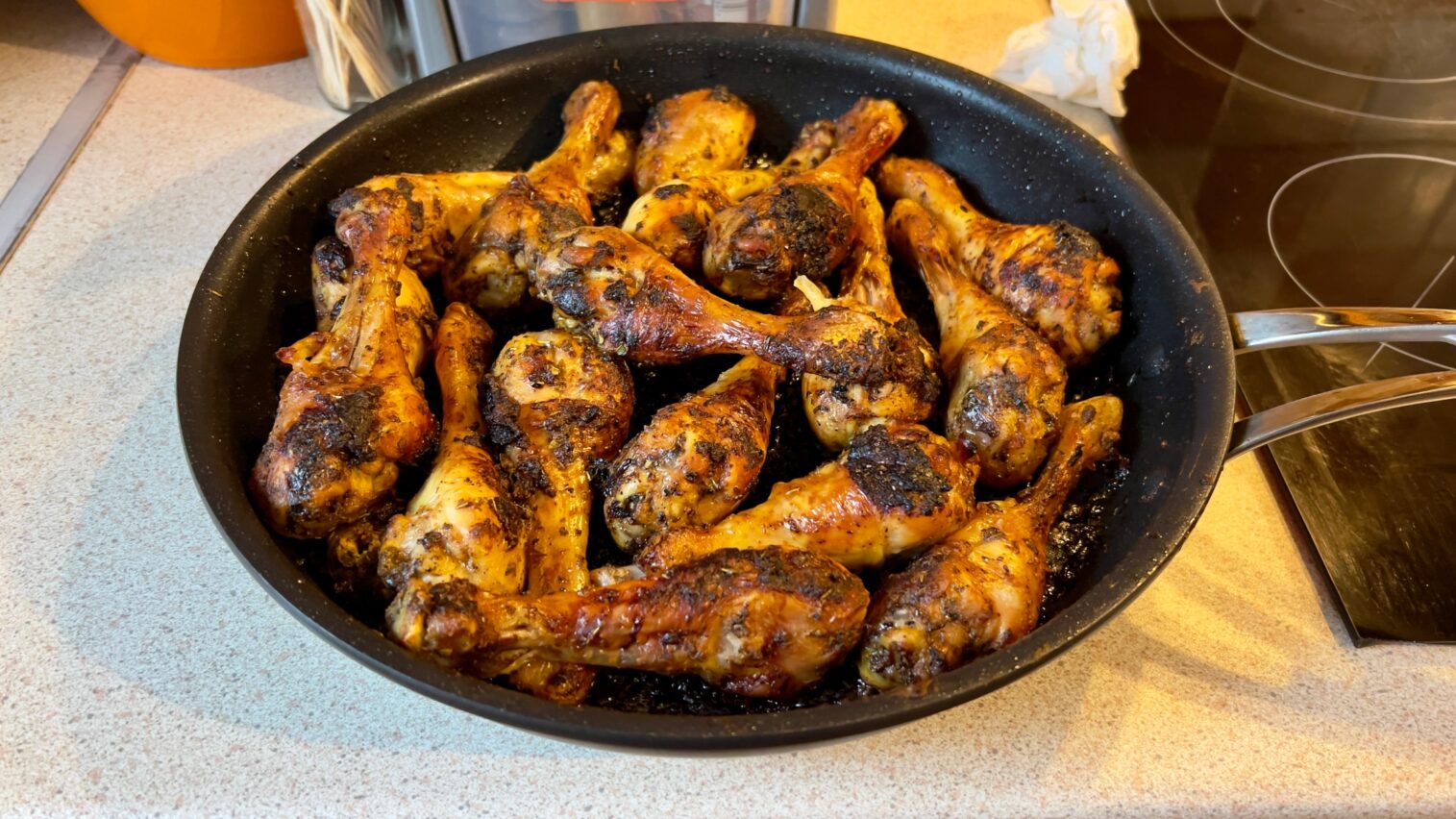 Chicken drumsticks (fried on a pan, then slow cooked in the oven on the same pan):